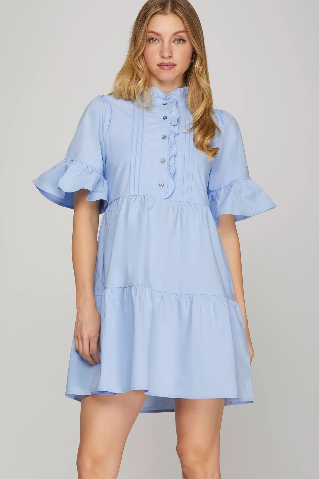 BLUE BELL SLEEVE RUFFLE NECK BUTTON DOWN MINI DRESS