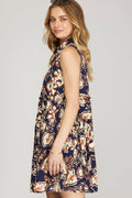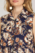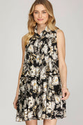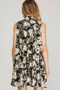 BLACK SLEEVELESS BUTTON UP WOVEN LEAF PRINT TIERED DRESS