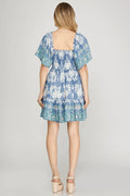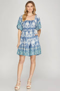 BLUE SMOCKED BORDER PRINT WOVEN MINI DRESS