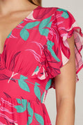 This vibrant fuchsia mini dress features playful tiered ruffled sleeves and a smocked waist that offers a comfortable, flattering fit. Crafted from woven fabric, it’s perfect for adding a pop of color and fun to your warm-weather wardrobe.