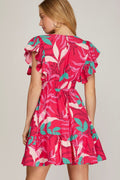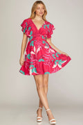 FUCHSIA TIERED RUFFLED SLEEVES SMOCKED WAIST WOVEN MINI DRESS