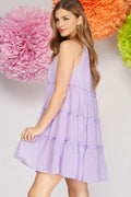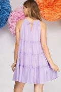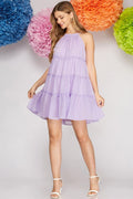 Step into spring with this lilac sleeveless mini dress featuring charming Swiss dot fabric and a playful tiered woven design. Light and breezy, it adds a flirty bounce to your look, perfect for sunny days and carefree moments. Embrace a fun, feminine vibe that’s as sweet as it is stylish!