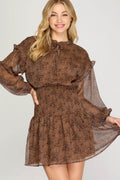 MOCHA RUFFLED DROP SHOULDER SMOCKED SKIRT MINI DRESS