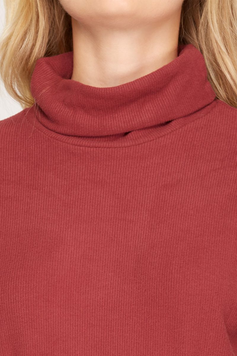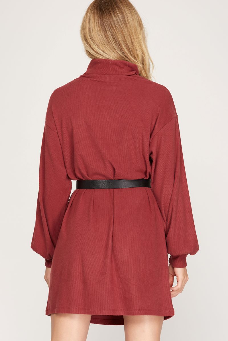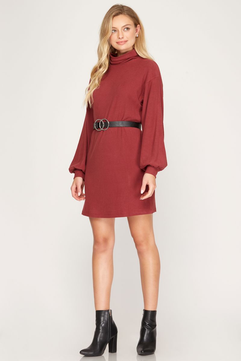 RED BEAN BRUSHED KNIT TURTLENECK MINI DRESS