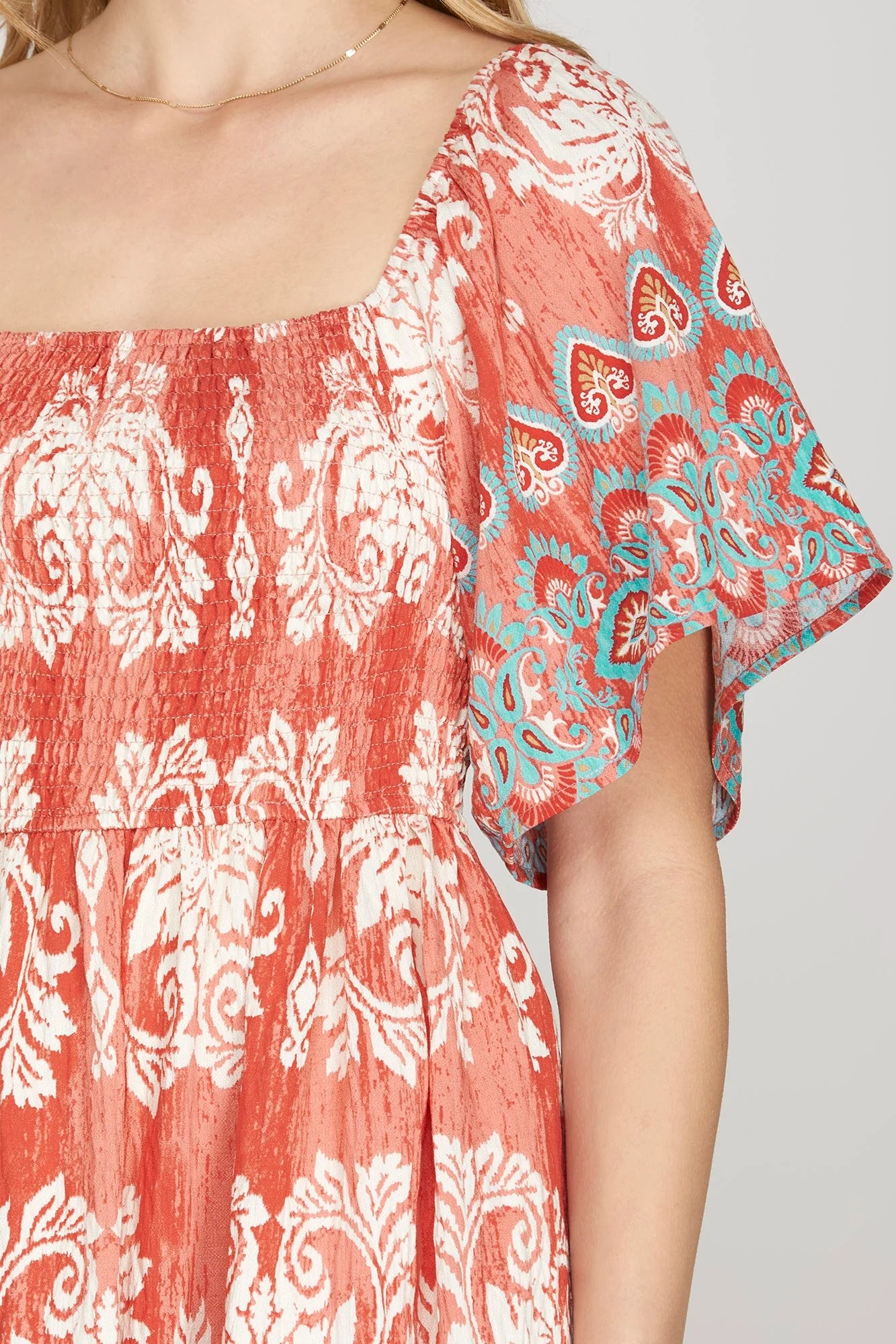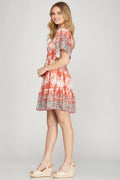 RED SMOCKED BORDER PRINT WOVEN MINI DRESS