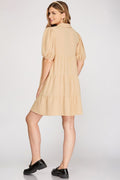 Step out in style with this taupe mini dress featuring charming short puff sleeves and a flirty tiered skirt. Its playful silhouette adds a fun, feminine touch perfect for sunny days or casual nights out. Lightweight and easy to wear, this dress brings effortless chic to your wardrobe.