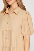 TAUPE SHORT PUFF SLEEVES TIERED SHIRT MINI DRESS