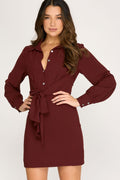 Step out in style with this playful mini dress featuring long cuff sleeves and a charming front tie detail. The rich wine color adds a touch of boldness, while the woven fabric ensures a comfortable fit. Perfect for flirty daytime adventures or evening fun, this dress combines elegance with a fun, youthful vibe.
