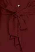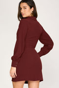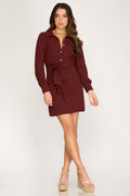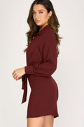 WINE LONG CUFF SLEEVES W/FRONT TIE WOVEN MINI DRESS